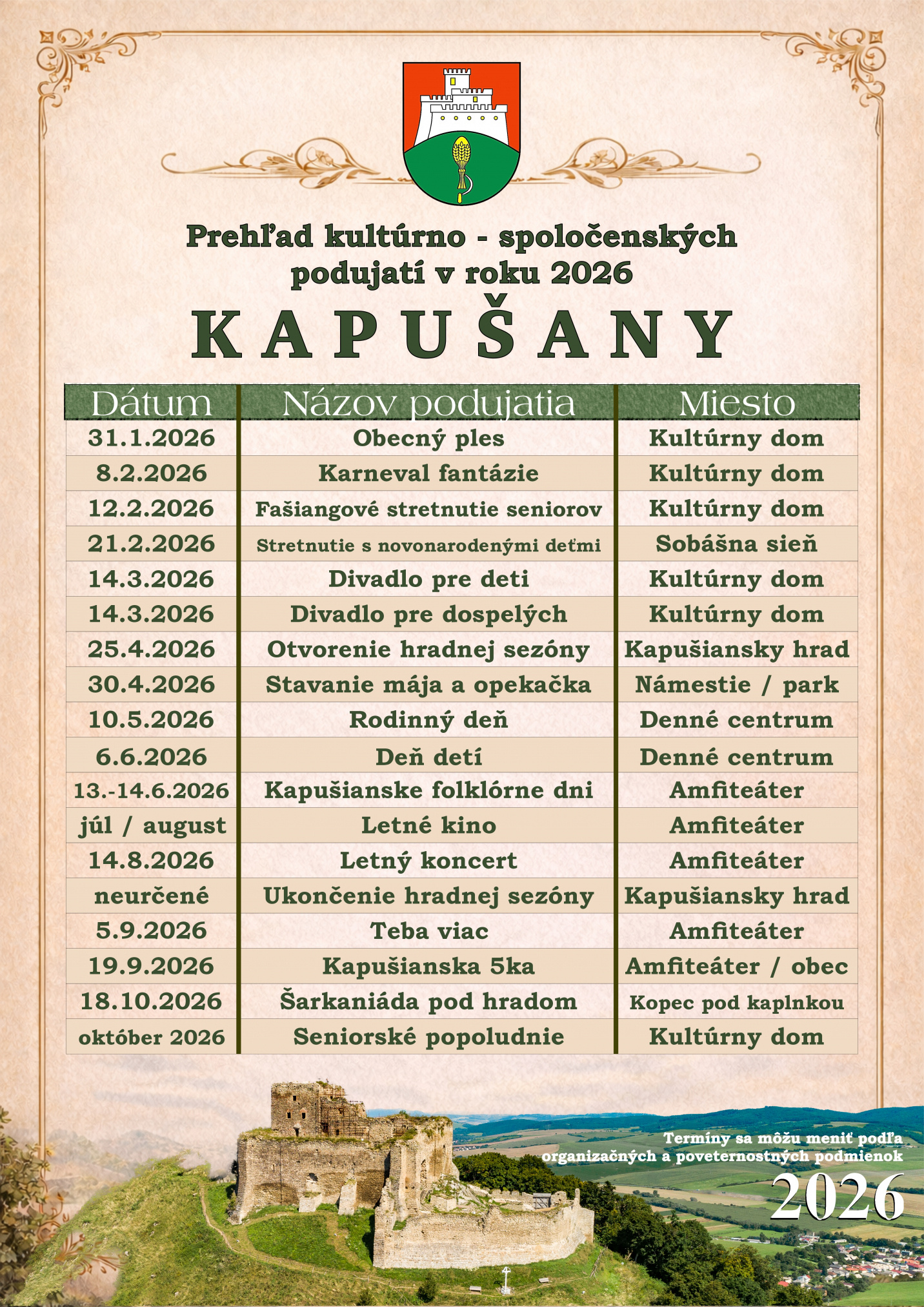 Počas roka nás čaká pestrá mozaika podujatí – od farebného Karnevalu fantázie , fašiangových stretnutí a divadiel, cez Kapušianske folklórne dni, letné kino a koncert pod holým nebom, až po športové akcie, Šarkaniádu pod hradom a príjemné seniorské popoludnia.