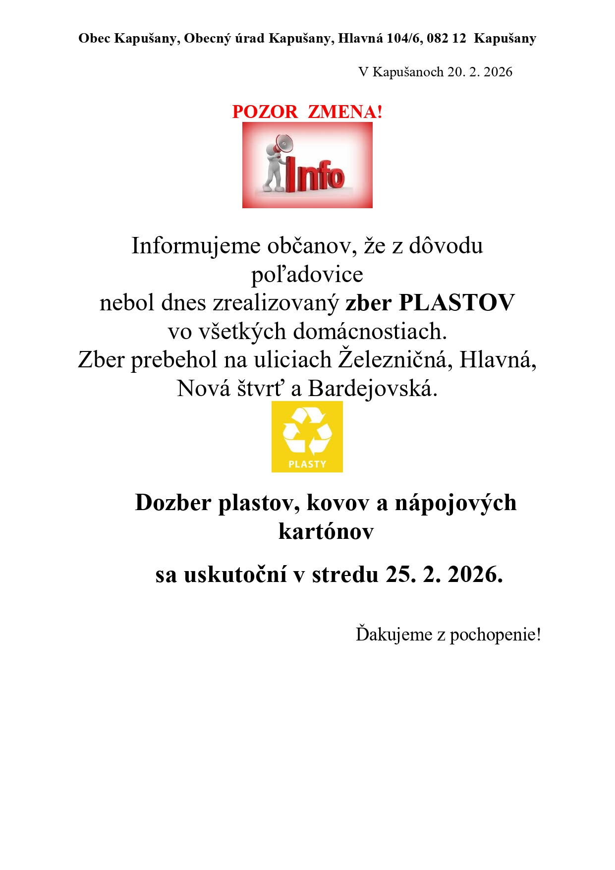 Neuskutočený zber plastov 20. 2. 2026 nárhadný termín