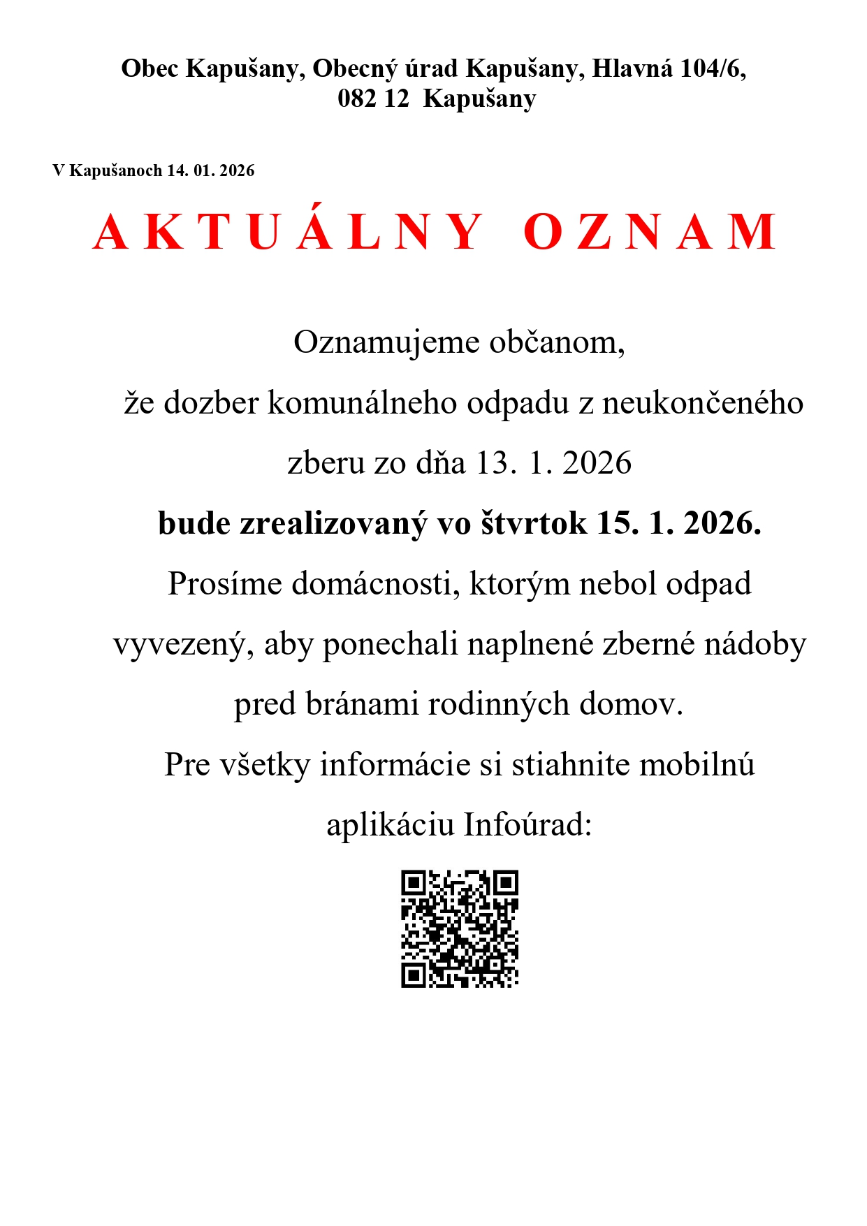 Oznam dozber komunálneho odpadu 15. 1. 2025