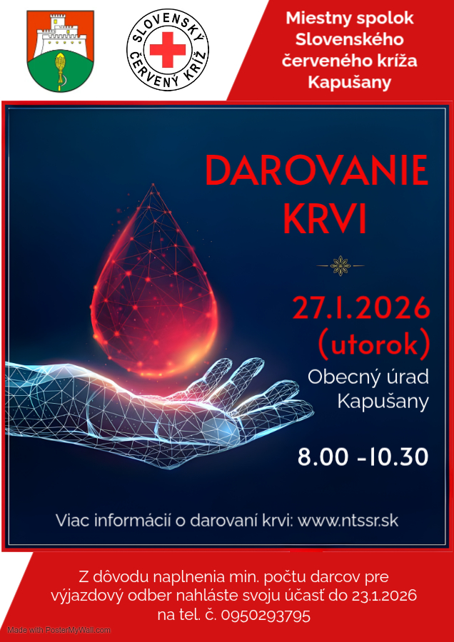 Oznam mobilný odber krvi 27. 1. 2026 Obecný úrad Kapušany