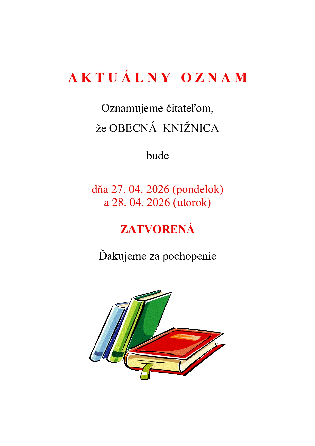 Oznam obecná knižnica v pondelok a v utorok zatvorená