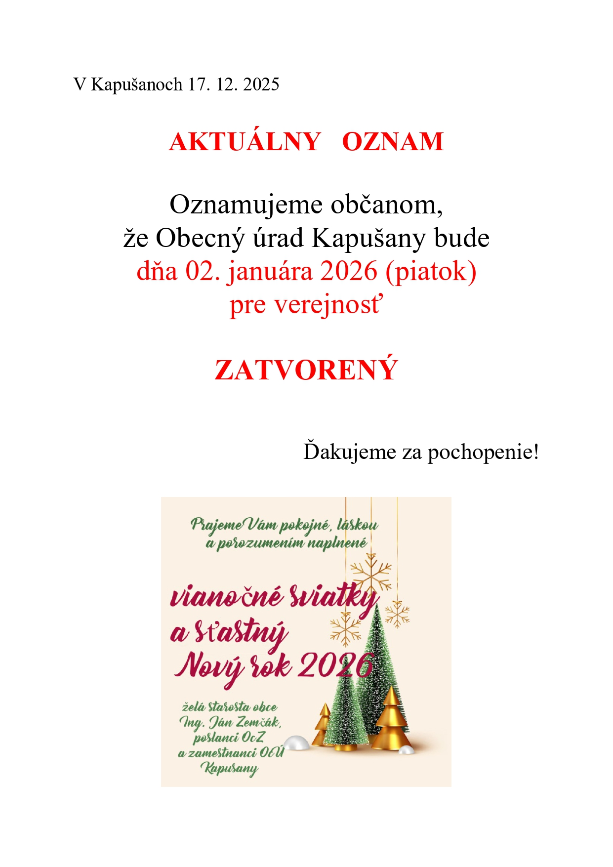 Oznam Obecný úrad Kapušany bude dňa 2. januára 2026 pre verejnosť zatvorený