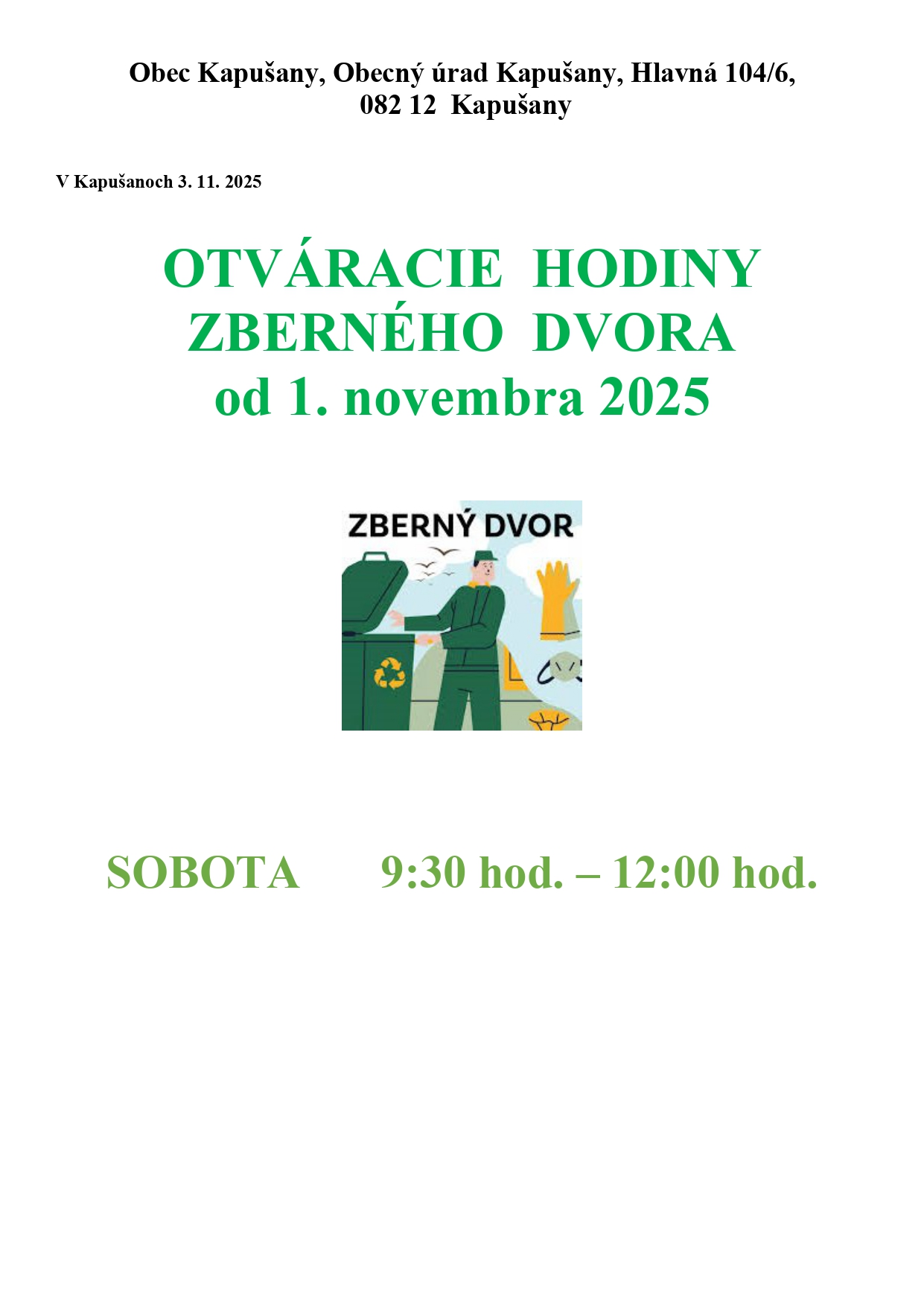 Oznam otváracie hodiny Zberný dvor Kapušany od 1. 11. 2025