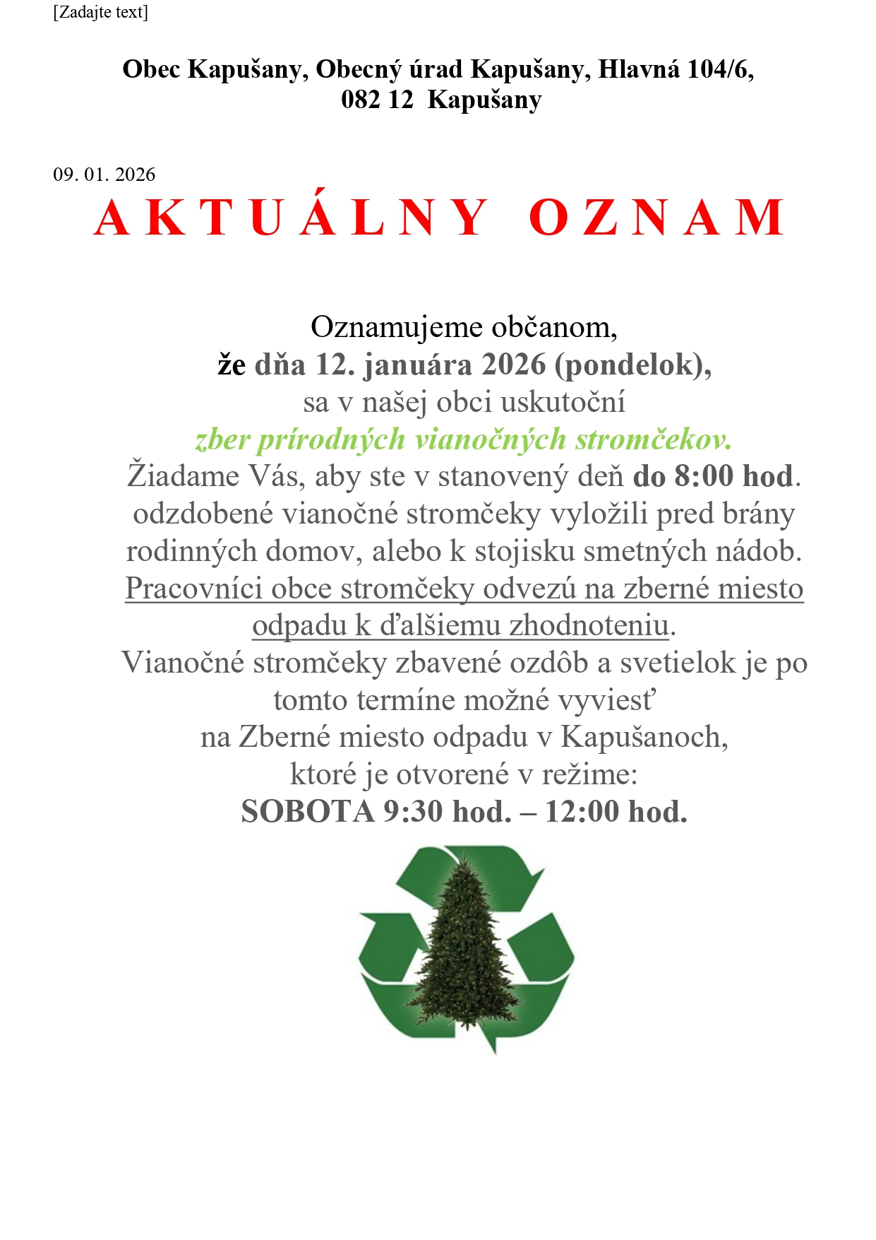 Oznam zber vianočných stromčekov 12. 1. 2026