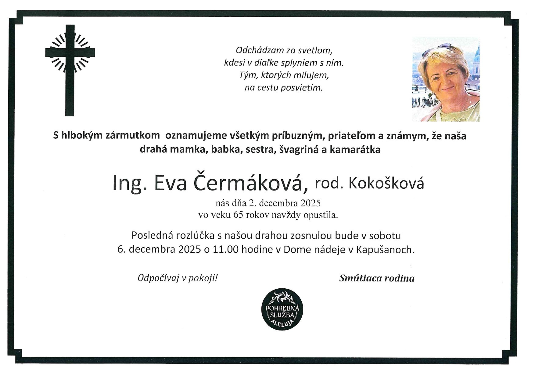S ľútosťou Vám oznamujeme, že vo veku 65 rokov nás dnes navždy opustila p. Eva Čermáková, rod. Kokošková, bývajúca v Košiciach, rodáčka z našej obce Kapušany. Posledná rozlúčka so zosnulou bude v sobotu 6. 12. 2025 o 11:00 hod. v Dome smútku v Kapušanoch.